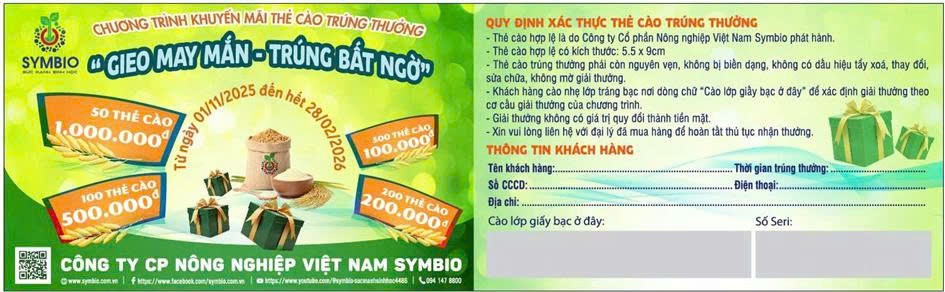 Lưu ý: Thẻ cào trúng thưởng có giá trị sử dụng tương đương voucher. Voucher sẽ sử dụng để mua tất cả các sản phẩm của Công ty cổ phần Nông nghiệp Việt Nam Symbio phân phối tại các đại lý theo danh sách đính kèm. Với đơn hàng có giá trị cao hơn voucher, khách hàng cần thanh toán thêm phần chênh lệch cho đại lý. Voucher không giới hạn thời hạn sử dụng. Giải thưởng không có giá trị quy đổi thành tiền mặt
